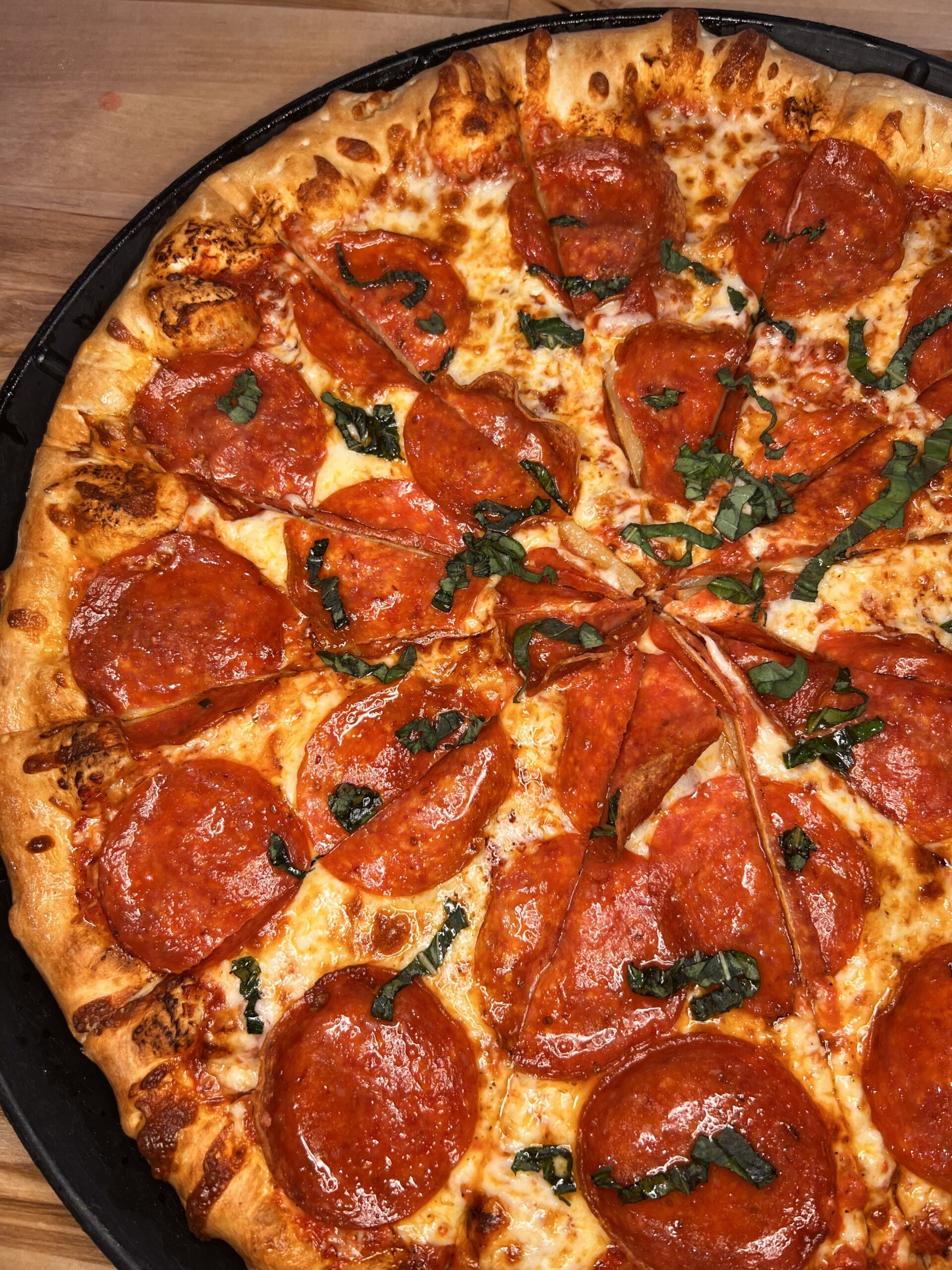 Red Sauce, Mozzarella, Pepperoni, Sausage, Grilled Onions & Peppers, Fresh Basil